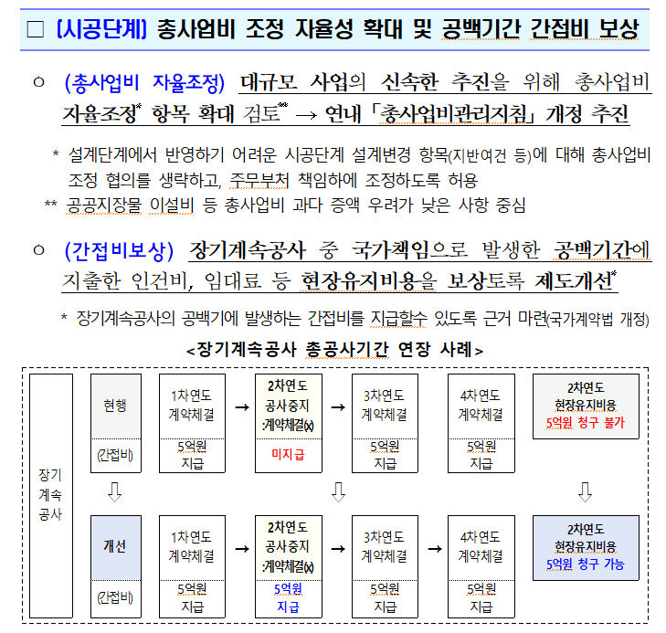 그중, 시공단계에사 장기계속공사 중 국가의 책임으로 사업지연이 발생할 경우 인건비, 임대료 등 현장유지 비용을 보상하도록 국가계약법을 개정할 계획이다.