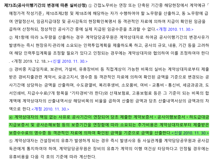 정부입찰계약집행기준 제73조(공사이행기간의 변경에 따른 실비산정) 제4항에서는 계약상대자의 책임 없는 사유로 공사기간이 연장되어 당초 제출한 계약보증서ㆍ공사이행보증서ㆍ하도급대금 지급보증서 등의 보증기간을 연장함에 따라 소요되는 추가비용은 계약상대자로부터 제출받은 보증비용의 영수증 등 객관적인 자료에 의하여 확인된 금액을 기준으로 금액을 산출하도록 명시되어 있습니다.
